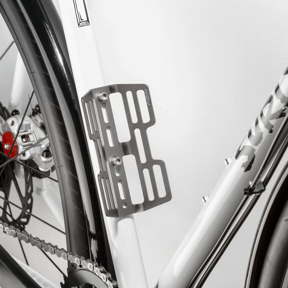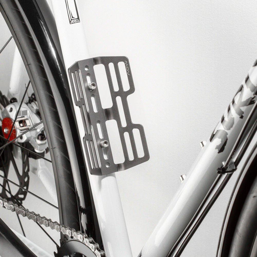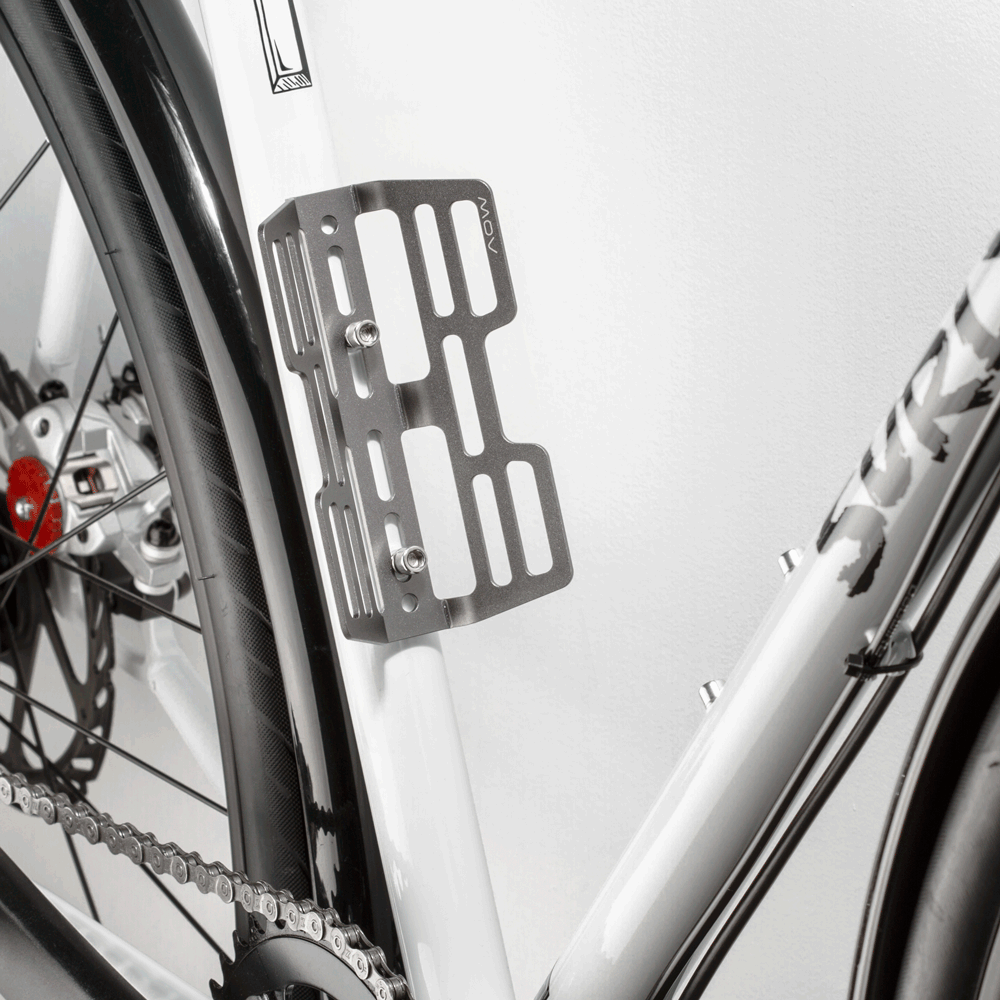 A lightweight and resizable rack can attach to MOV mounts or double/triple-screw mounts prefabbed on bike frames. It is suitable for carrying a large plastic bottle or metal flask, storage pouch, spare tires and inner tubes, etc., with different types of straps.