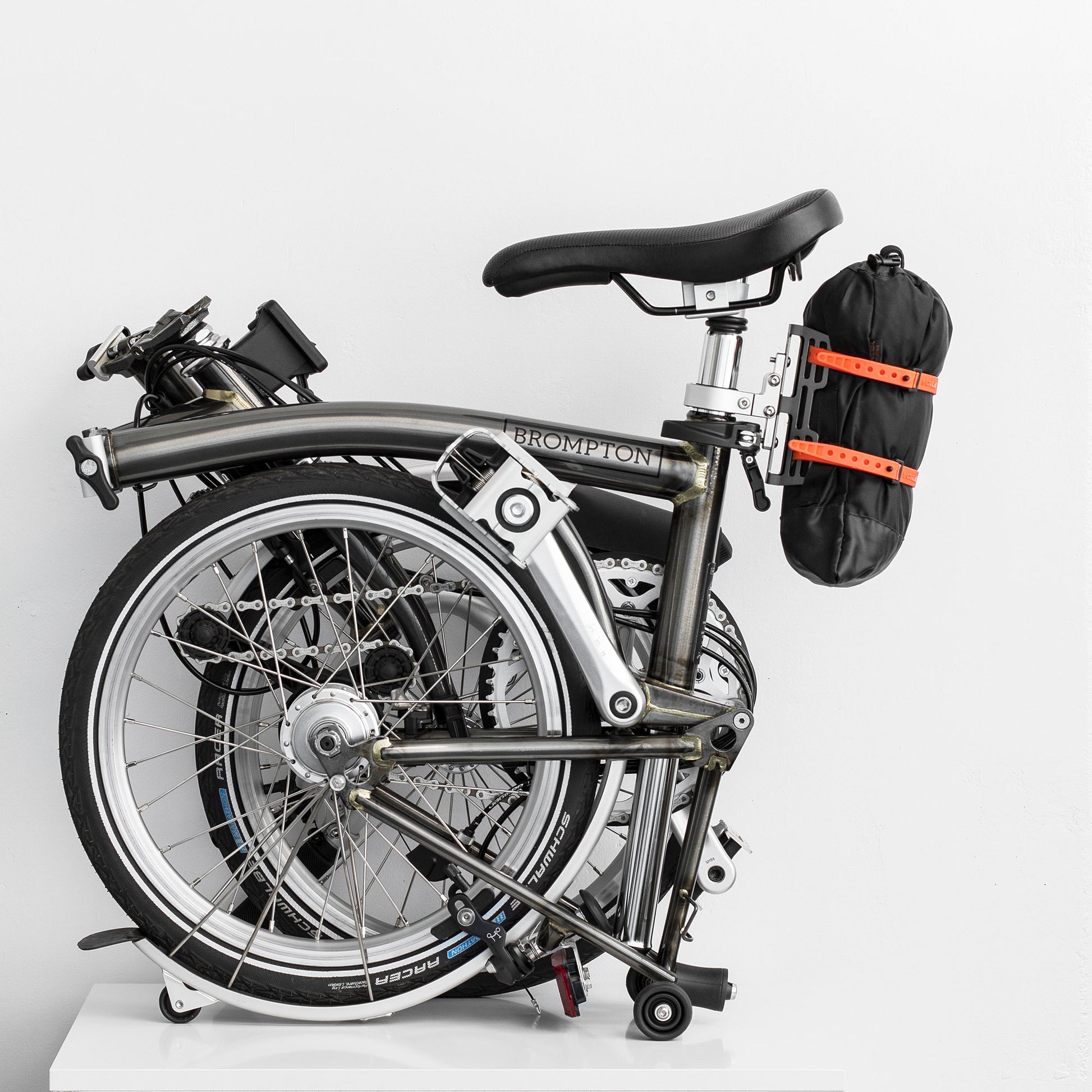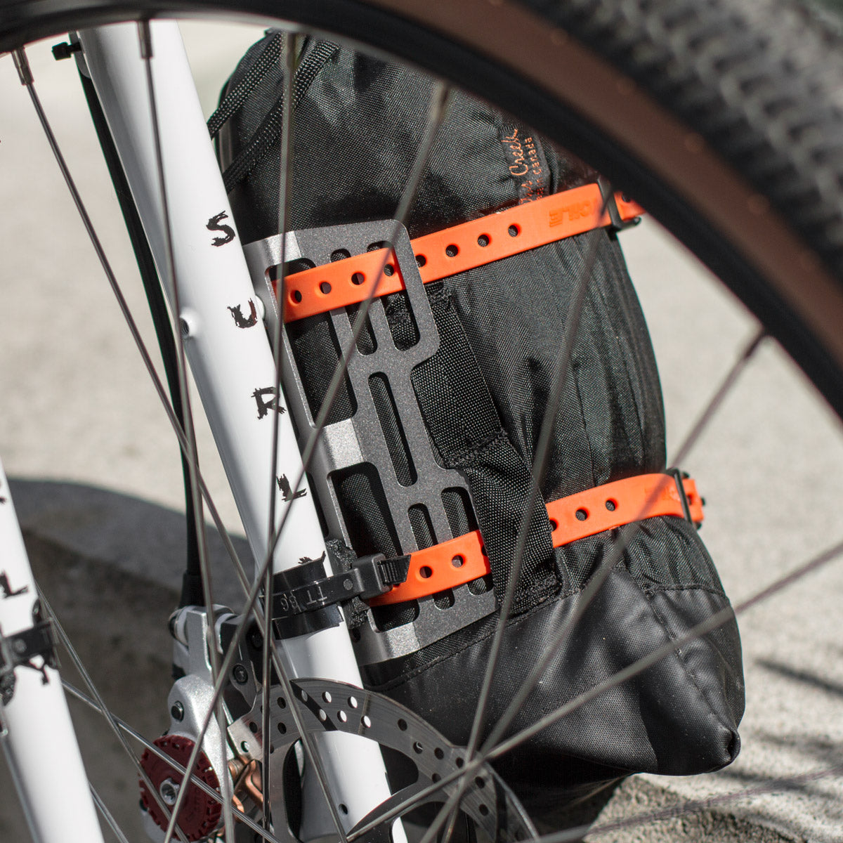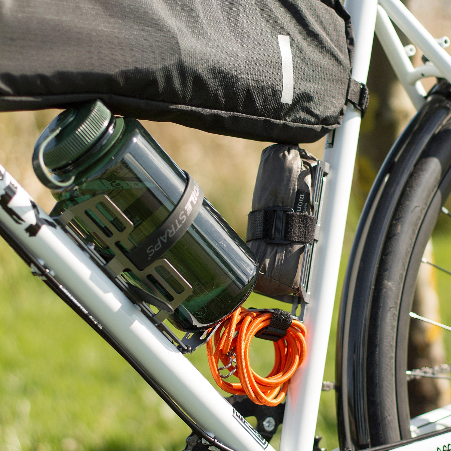 A lightweight and resizable rack can attach to MOV mounts or double/triple-screw mounts prefabbed on bike frames. It is suitable for carrying a large plastic bottle or metal flask, storage pouch, spare tires and inner tubes, etc., with different types of straps.