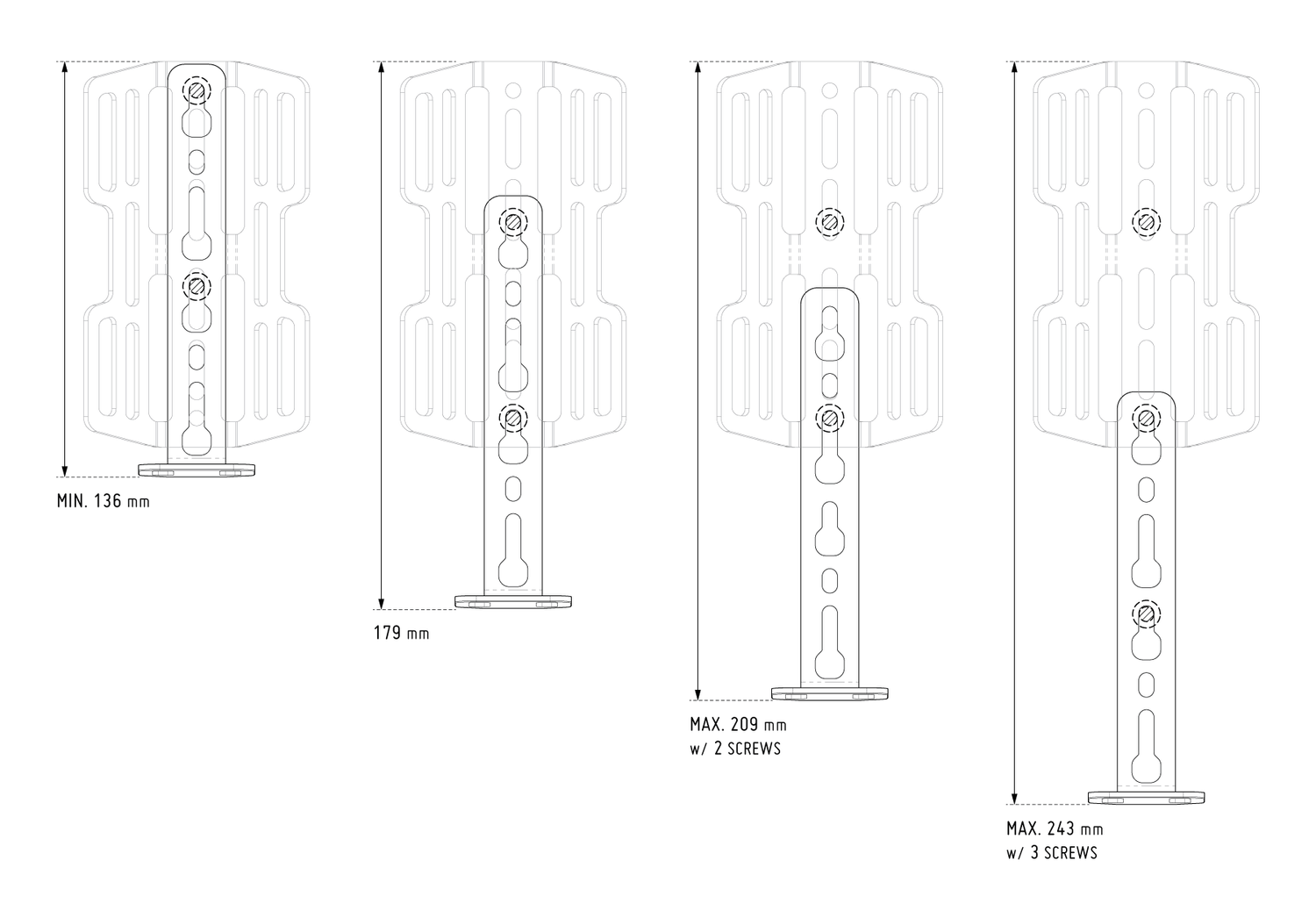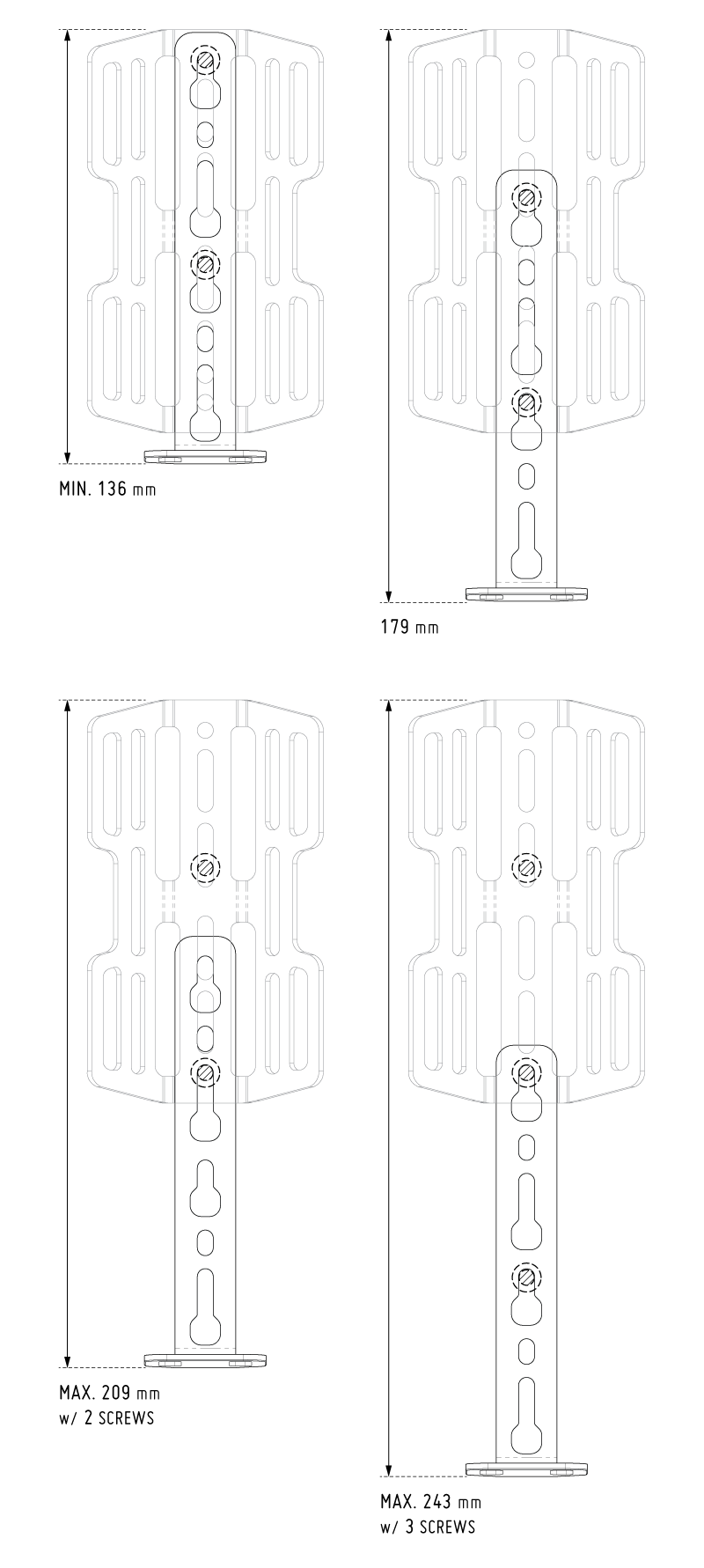 The diagrams demonstrate the overall length in basic setups. The final length varies according to different rack and bracket arrangements.