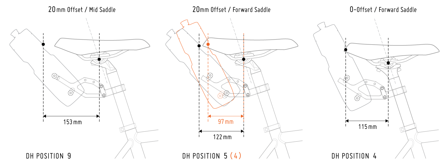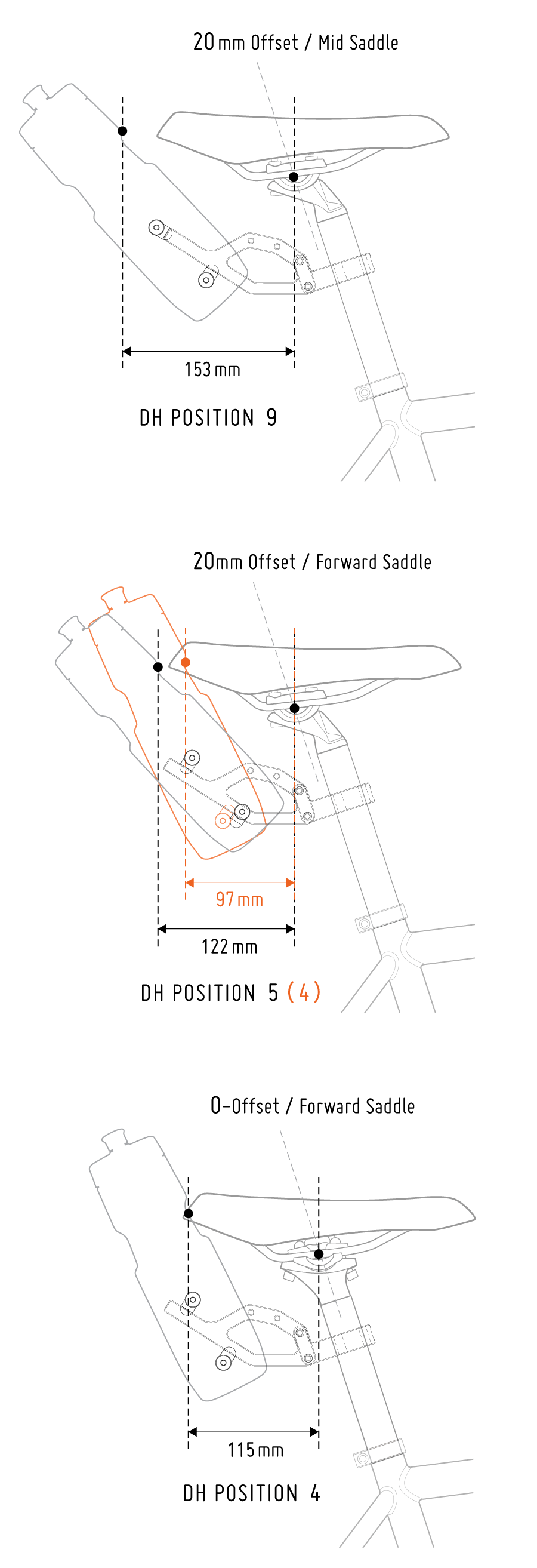 When space is insufficient to use with a setback seat post and backward saddle, users can switch the D.H. setting to a lower bottle angle or move the whole M.M.S. to a lower position.