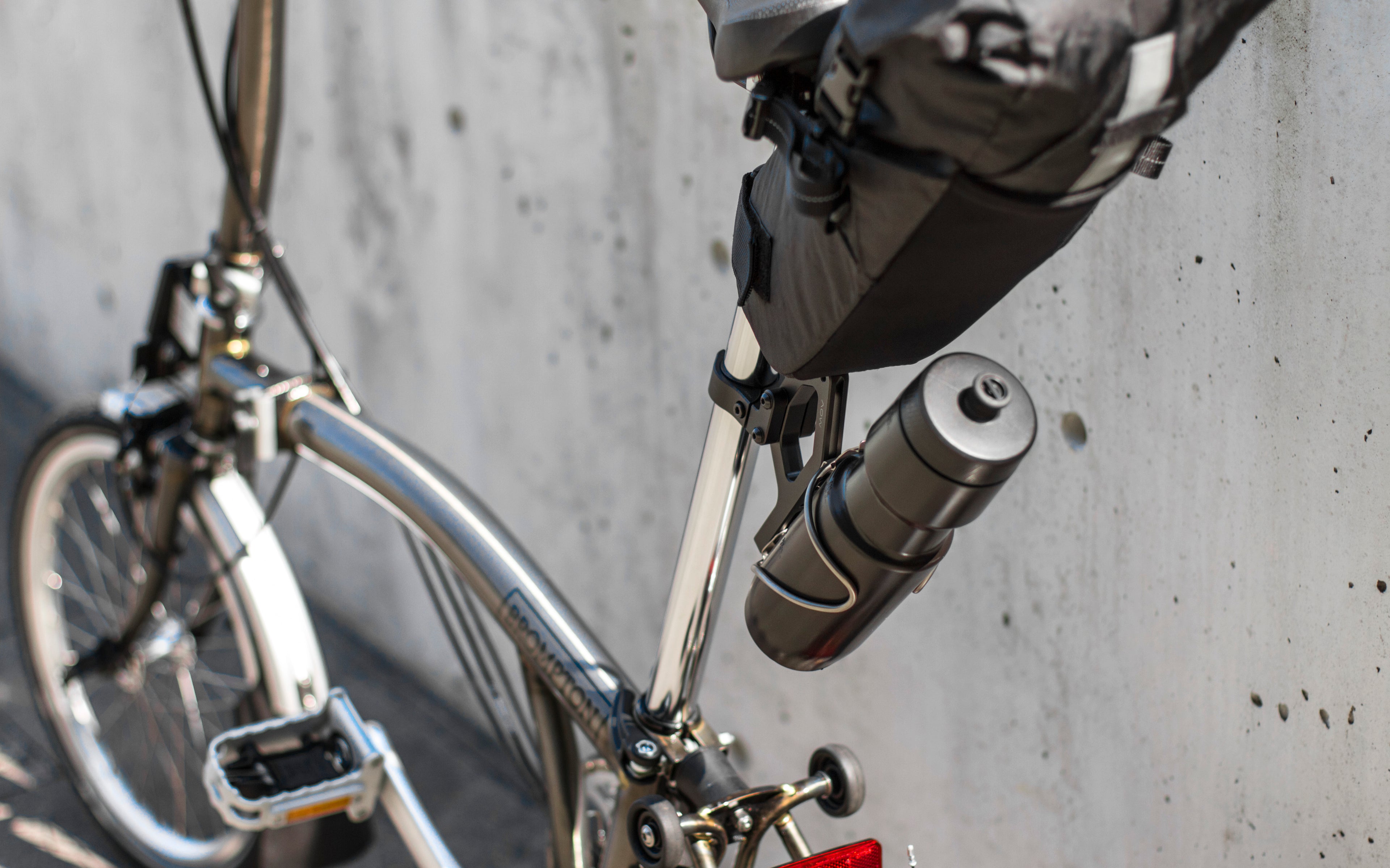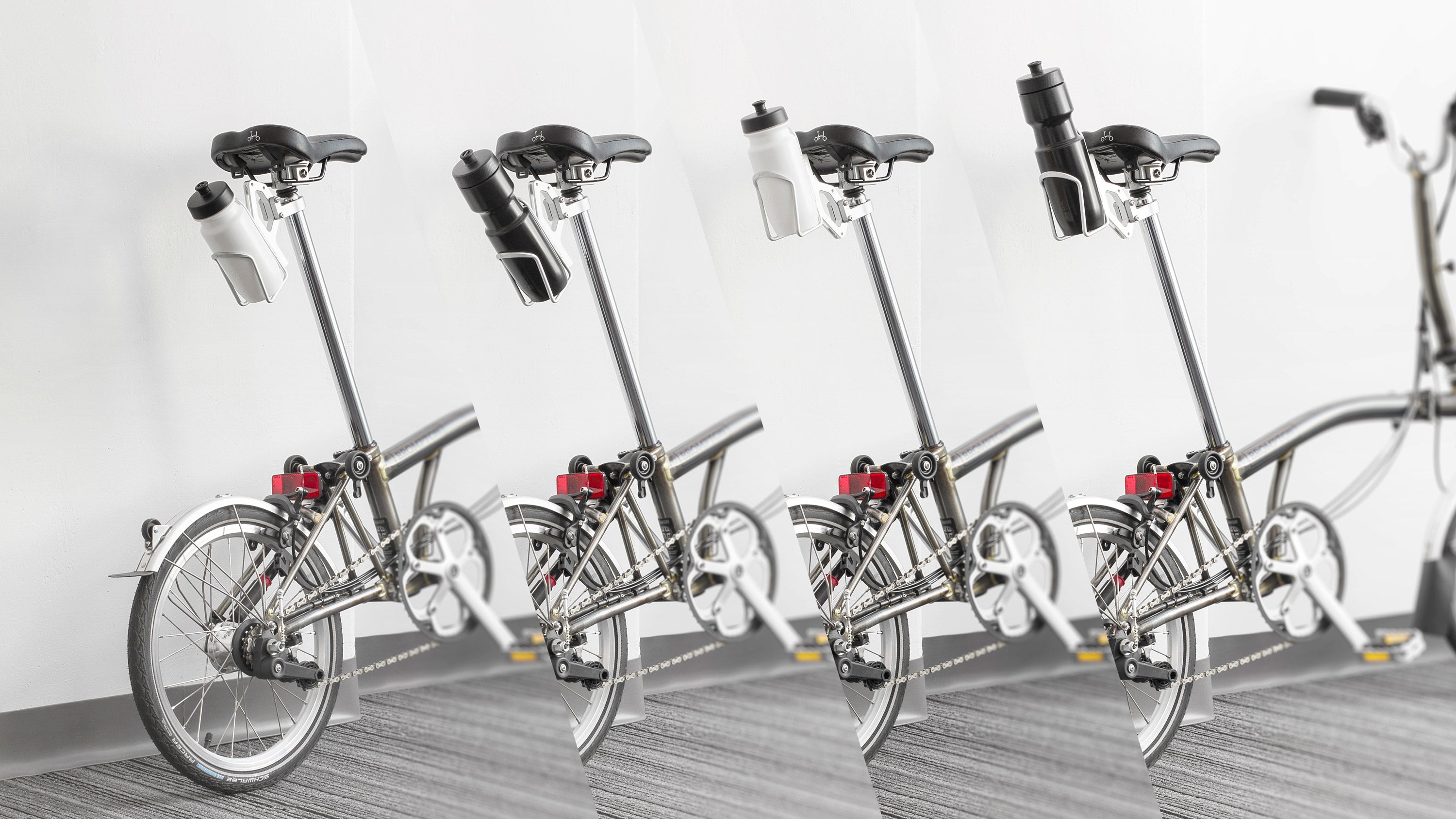 Use with the Ø31.6/8 Base Clamp, Brompton users can enjoy the convenience of storing a large or small bottle behind the saddle at your preferred angles, before and after folding.