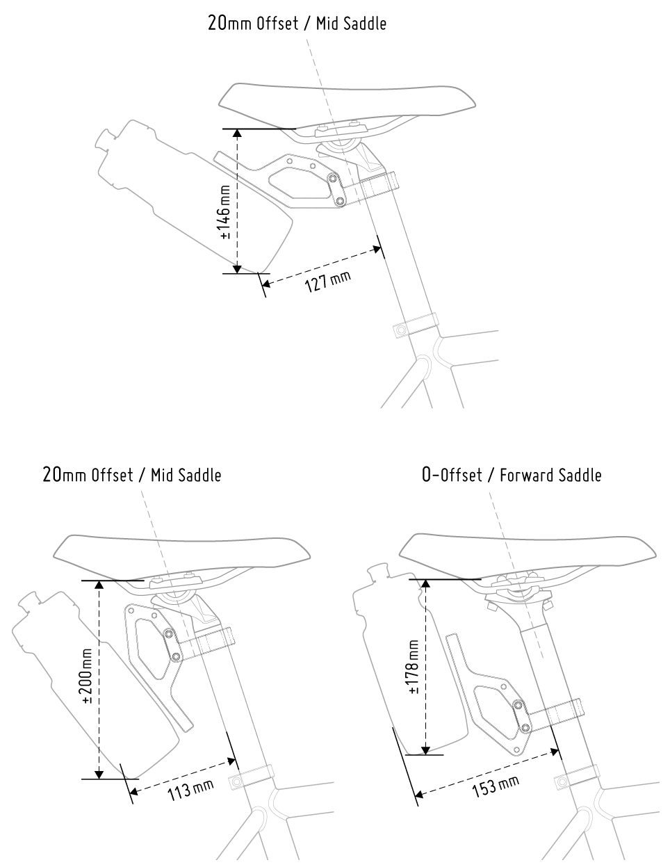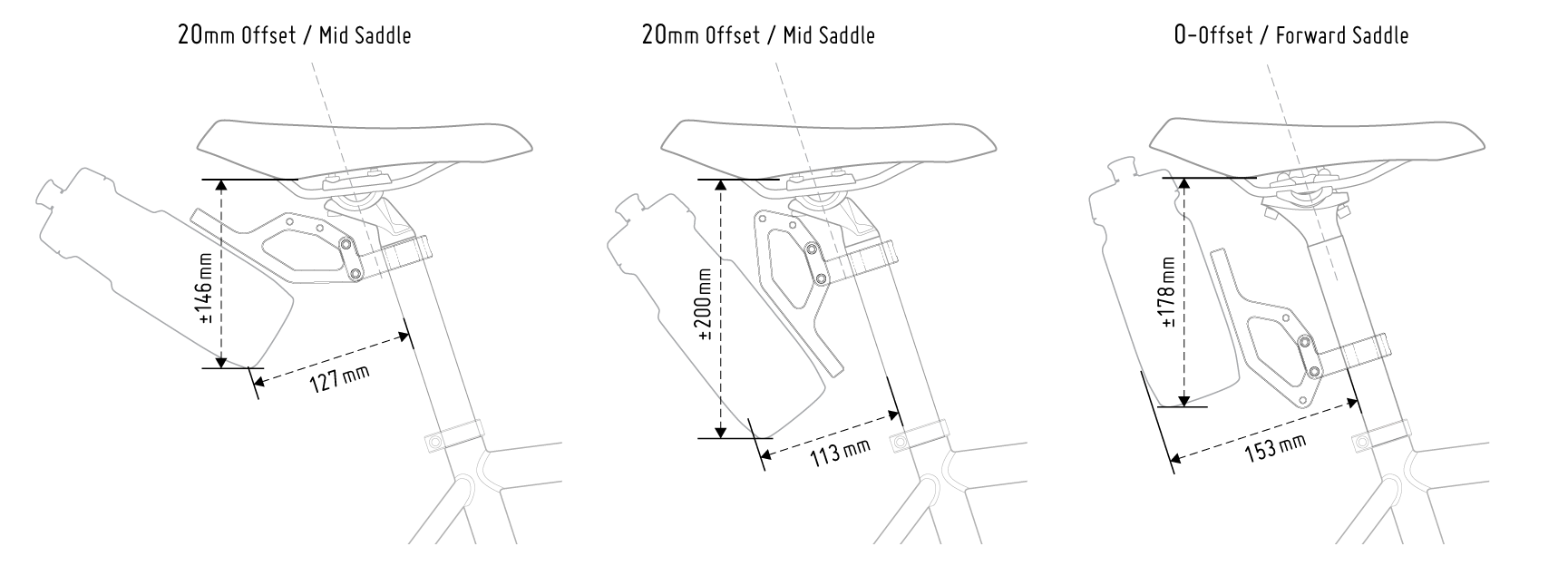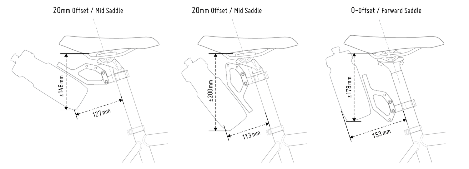 If you’re using a rear rack with a cargo bag or attachment on top of it, the diagrams will give you rough measurements of the space required for attaching one water bottle in different positions.