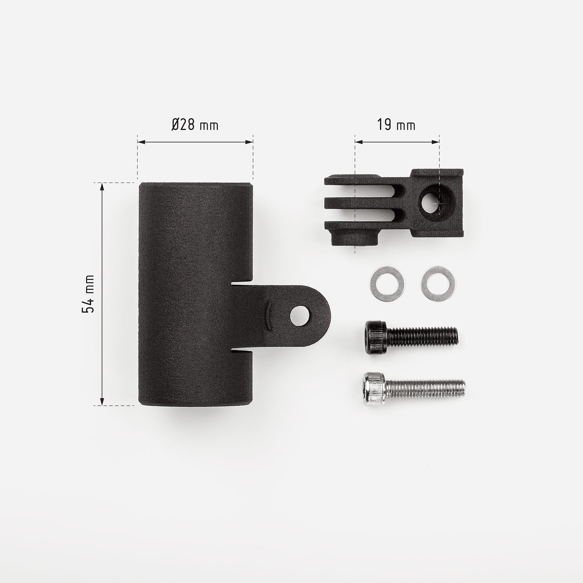 The adapter securing the tube holder, comes with a 3-to-2 slot-locking mechanism commonly found at GoPro and Garmin devices, can also be used to attach lightweight action cam equipped with the same locking hardware.